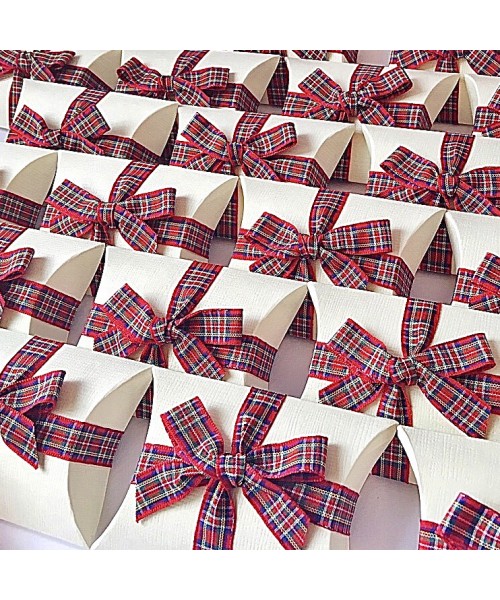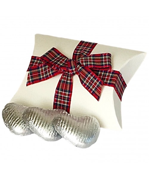 Beautiful Pillow shaped favour box featuring a traditional hand tied tartan bow and filled with a selection of tempting chocolate treats inside.